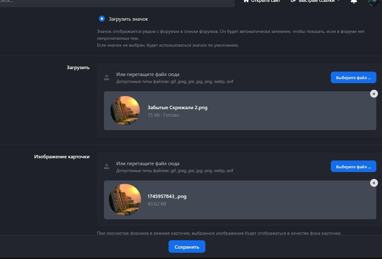 Вот так всё происходит: При этом если грузить как карточку всё ставится (нижняя опция). Но мы используем другой вид (значок, а не карточку). На сервере посмотрели - картинки идут в папку загрузок, но почему то никак не ставятся в итоге на раздел форума. При входе заново в меню загрузки иконки значка нет.