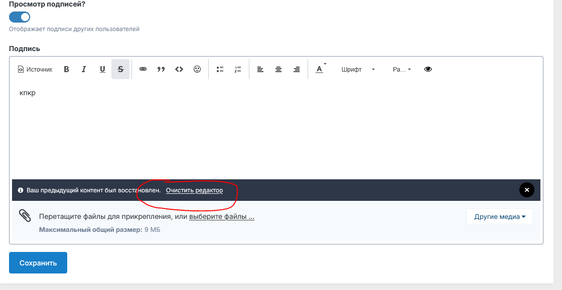 Всем привет! Очень долго ломал голову над следующей проблемой: На IPS 4, если вписать в подпись любой символ и сохранить, а после стереть и попытаться сохранить, тот самый символ сохранится, и эта проблема сохраняется вне зависимости от содержимого подписи. Пример: Вписываем в подпись фразу: "Колобок круглый" и сохраняем - подпись сохраняется; удаляем фразу "Колобок круглый" и сохраняем - фраза остаётся, подпись убрать не представляется возможным. Тестировалось на версиях: 4.7.23 (лицензия) и 4.7.22 (нуллед, скачанный из IPBMafia). Подскажите, сталкивался ли кто-нибудь с этим, и как решить? Перепробовал многое, но желаемого результата не достиг.
